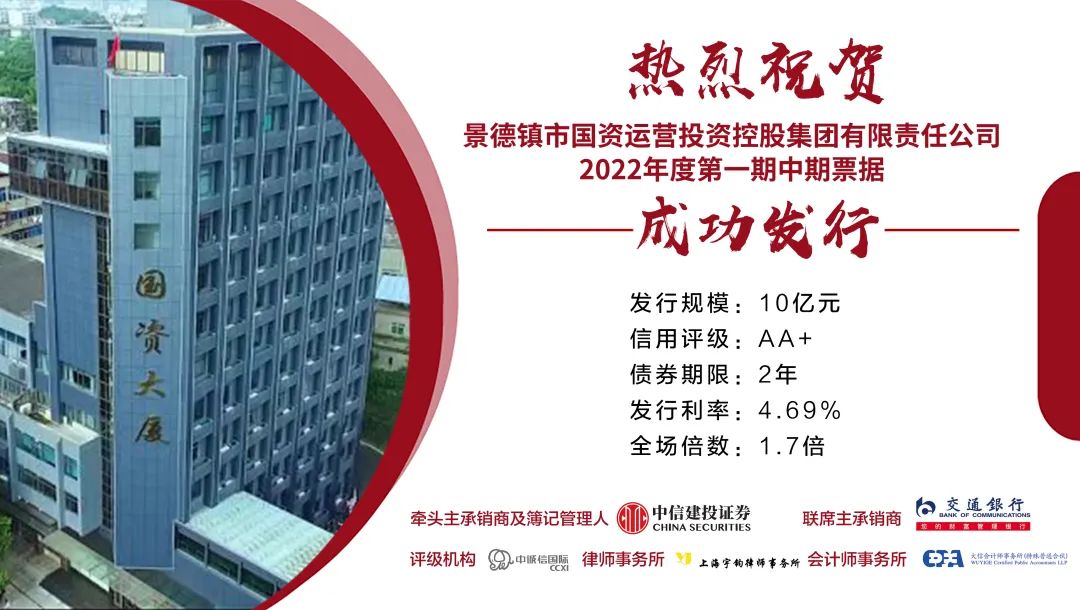 4月6日,景德鎮市國資運營投資控股集團有限責任公司2022年度第一期中期票據成功發行,發行規模10億元,債券期限2年,信用評級AA+,發行利率4.69%,創近一年以來江西省同評級同期限地方國有企業債券發行票面利率新低!近一年以來,景德鎮市中長期債券發行首次價格低于5%!