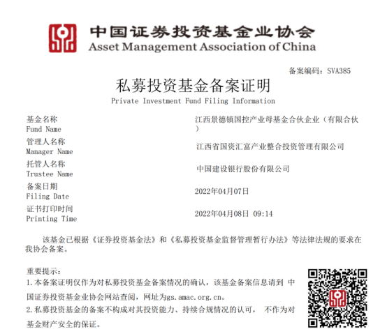 2022年4月7日,由景德鎮國控金融發展有限公司與江西省國控、昌江區國資合作發起組建的江西景德鎮國控產業母基金合伙企業(以下簡稱“母基金”)在中國證券投資基金業協會成功備案,標志著母基金正式進入投資運作階段。