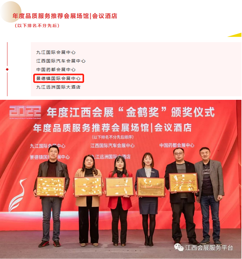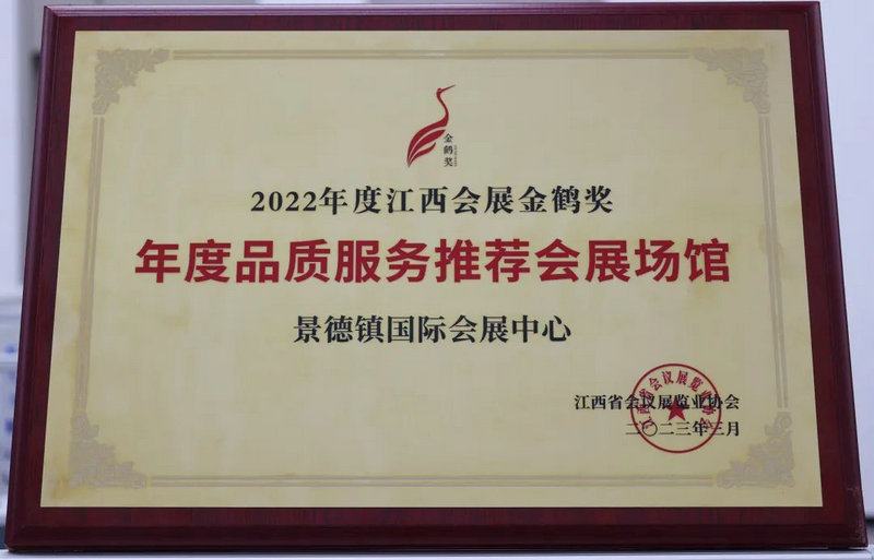 近日,在2022年度江西會展“金鶴獎”評選活動中,景德鎮陶博城國際會展中心榮獲“年度品質服務推薦會展場館”稱號。