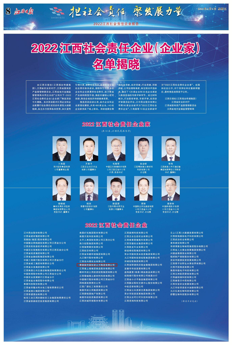 6月2日,由江西日報社(江西報業傳媒集團)、省農業農村廳、省國有資產監督管理委員會、省地方金融監督管理局共同主辦的“義利天下·2022江西社會責任企業(企業家)”推選活動正式揭曉,景德鎮市國控集團旗下國信瓷立方陶瓷有限公司從全省480家企業中脫穎而出,成為景德鎮市唯一入選企業。