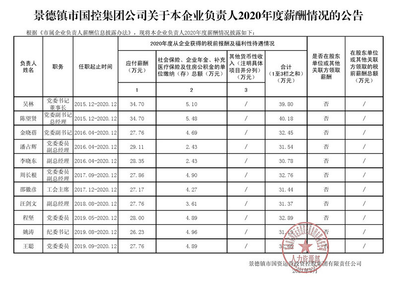 景德鎮(zhèn)市國控集團公司關(guān)于本企業(yè)負責人2020年度薪酬情況的公告
